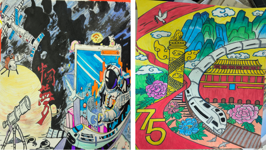 本次绘画、海报设计比赛吸引了学院众多同学参与,他们以丹青为媒介,以色彩作画笔, 用一幅幅绘画、海报作品抒发了对伟大祖国的祝福。参赛作品内容丰富、形式多样,既包含展现祖国大好河山的壮美画卷,又有描绘人民幸福生活的温馨场景;既有对历史瞬间的珍贵回顾,也有对未来的美好憧憬。其中,优秀海报作品《中国梦》以中国航天事业的新成就为主题,生动展现了国家在科技领域取得的辉煌成就;优秀绘画作品《筑梦75周年》以视觉艺术的形式生动展现了新中国成立75周年以来的巨大变迁与伟大成就。