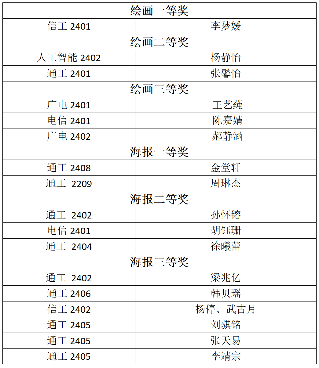 (通讯员 刘文进 郑雅轩)为激发学生的爱国情怀,丰富学生的校园文化生活,通信与信息工程学院第九党员工作站举办“我和我的祖国”绘画、海报设计作品大赛,面向学院有绘画、海报设计兴趣特长的学生征集作品。其中,绘画比赛评选出一等奖1名、二等奖2名、三等奖3名及优秀奖若干名,海报设计比赛评选出一等奖2名、二等奖3名、三等奖6名及优秀奖若干名。
