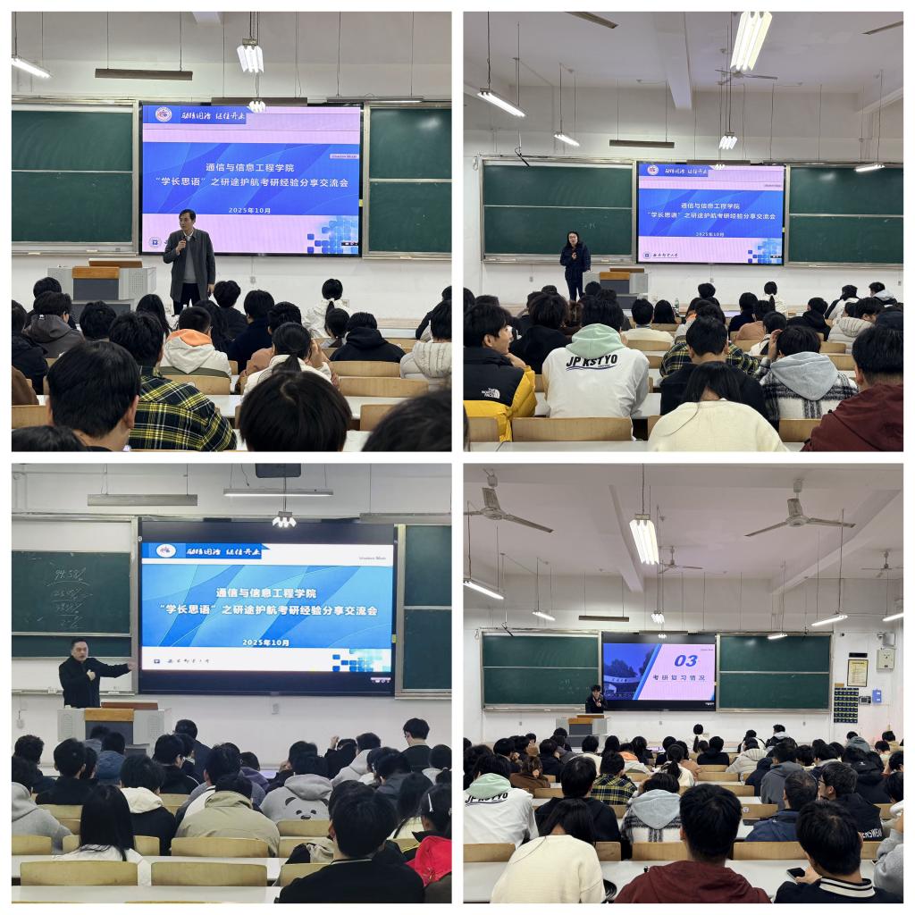 (通讯员 王昱)10月21日下午,通信与信息工程学院举办“学长思语”之研途护航考研经验交流分享会,邀请考研成绩优异的优秀校友和在校研究生分别为报考外校和本校毕业班学生分享备考经验。学院党委书记田卫蒙、副院长江帆、党委副书记陈伟超、院长助理薛健,学院毕业班辅导员及2026届全体考研学生参加活动。