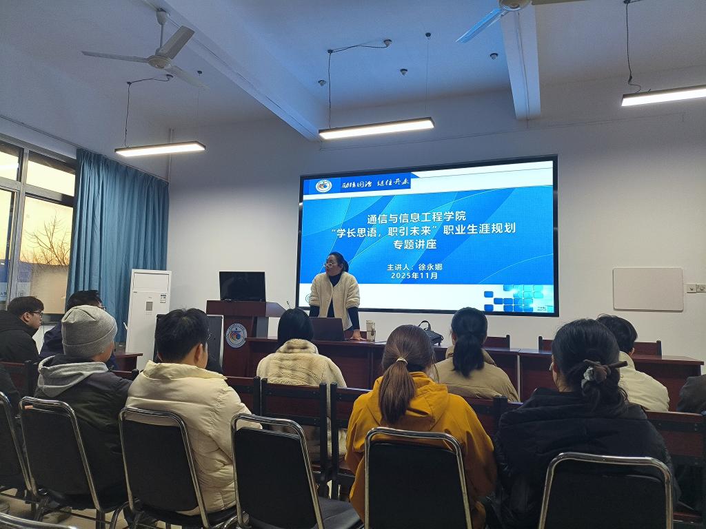 (通讯员 胡偌菲)11月25日下午,为提升毕业生就业竞争力,通信与信息工程学院在三号实验楼举办“学长思语,职引未来”职业生涯规划专题讲座。邀请华为ICT学院特聘就业指导老师、学院通信工程专业2015届优秀校友徐永娜担任主讲。