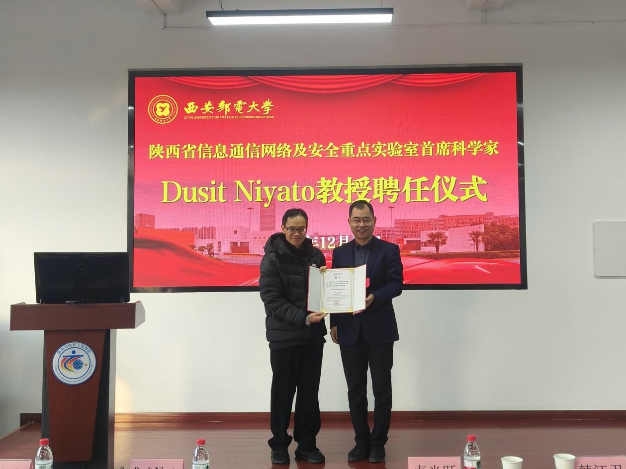 (通讯员 杨会杰)12月19日上午,我校举行陕西省信息通信网络及安全重点实验室首席科学家Dusit Niyato教授聘任仪式暨专家报告会。新加坡南洋理工大学Dusit Niyato教授、广东工业大学康嘉文教授、吉林大学孙庚教授及南洋理工大学青年学者代表,我校校长卢光跃,人事处、通信与信息工程学院负责人及师生代表参加仪式。聘任仪式由副校长韩江卫主持。